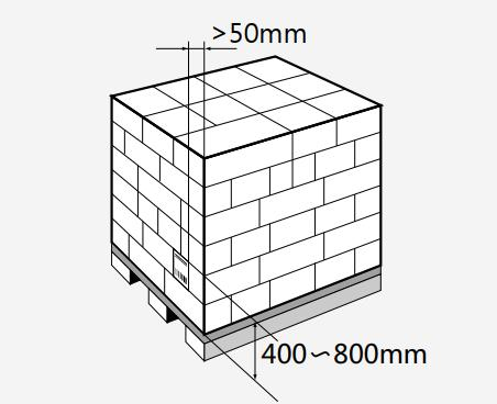 高度高于1m的物流單元:托盤和其他高度超過1m的物流單元,標(biāo)簽應(yīng)位于距離物流單元底部或托盤表面400mm至800mm的位置,標(biāo)簽與物流單元垂直底部的邊線的距離應(yīng)不小于50mm,如下圖所示。